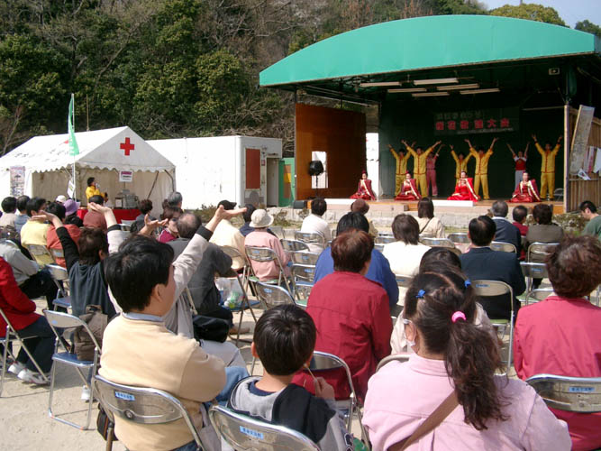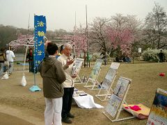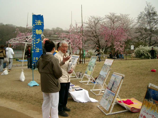 有一位日本人,他去年就看了学员们在樱花节上的演出,而且还邀请学员们一起唱卡拉OK并合影留念,今年学员们又看到了他。他说:他的大儿子原来去过北京大学留学,现在东京工作,与中国来的留学生接触非常多;他的小儿子,现在正在北京留学,学习中文。一位学员把中文的VCD《九评共产党》和《风雨天地行》送给了他,请他转给他的儿子,他欣然答应了。临走时,他对学员们说:“加油!加油!”
