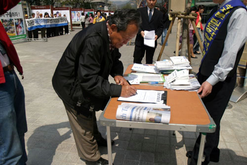 苏家屯及中共各劳教所活摘法轮功学员器官的暴行,激起了韩国各地民众的愤怒,有人看到法轮功学员遭受迫害的图片展后惊叫不已,有的民众给讲真相的法轮功学员送来了饮料以示同情和声援,有人惊叹:想象不到共产党竟然如此邪恶!大量的民众踊跃签名营救法轮功学员。某企业的赵会长气愤的说:如果有神灵的话,让他们惩治这些邪恶的中共分子。他拿了部份签名表到公司去,表示要让公司的员工都来签名。