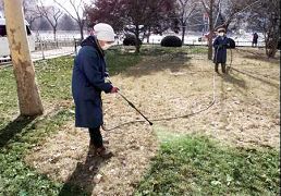 ![]() 2001年初申奥前,为欺骗奥委会官员,中共将枯草染绿。 图为中国工人正在向枯黄的草地喷洒。 |