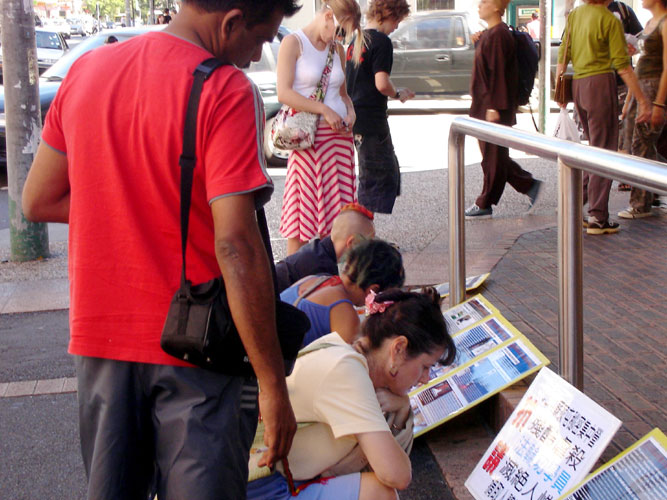 【明慧网2006年4月17日】2006年4月15日(星期六),为了继续揭露中共恶党活体摘除法轮功学员的器官,并杀人灭口的滔天罪行,澳洲昆士兰省的法轮功学员来到布里斯本中国城,设立真相点,摆放了相关真相图板、展开横幅,并向过往行人派发传单、讲真相