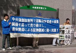 【明慧网2006年4月17日】2006年4月15日和16日周末,日本爱知县法轮功学员在名古屋(Nagoya)中领馆前举行活动,强烈抗议中共虐杀、活体盗取法轮功学员的内脏器官攫取暴利、焚烧遗体以销毁罪证的暴行,向过往行人发送揭露中共罪恶的真相资料,告诉人们现在正发生在中国大陆的法西斯野蛮行径,呼吁人们共同努力,制止中共对无辜的法轮功学员的迫害与人权侵犯。