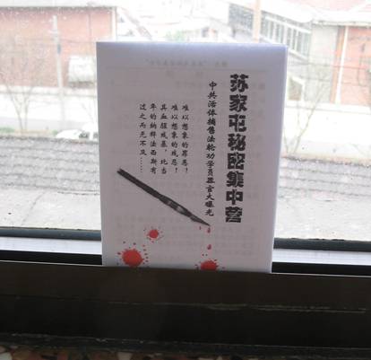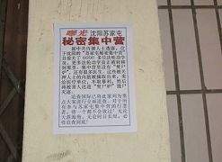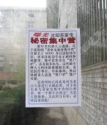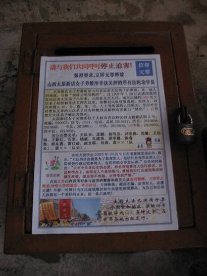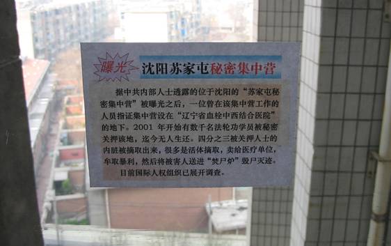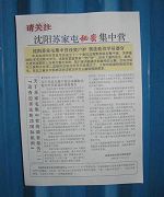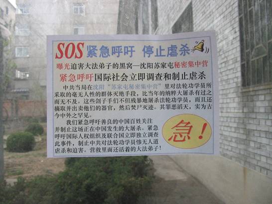 ![]() 贴在太原市人民政府主楼七层的不干胶《曝光沈阳苏家屯秘密集中营》 |