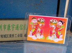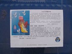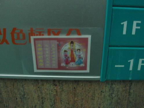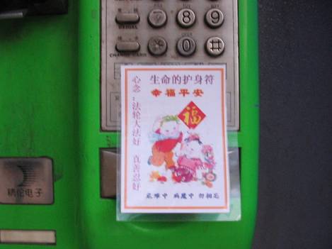 ![]() 张贴在水西巷通讯设施上的不干胶“SOS紧急呼吁 停止虐杀” | ![]() 放在傅家巷饭店露天小餐桌上的小册子《平安秘诀》和光盘《2006年全球华人新年晚会》 |