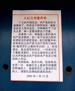 ![]() 张贴在龙潭公园电话厅里的不干胶《大纪元郑重声明》 | ![]() 放在龙潭公园电话厅里的小册子《秘密集中营――中共活体摘售法轮功学员器官大曝光》 |
