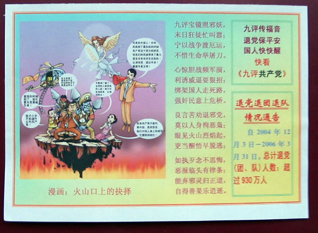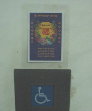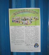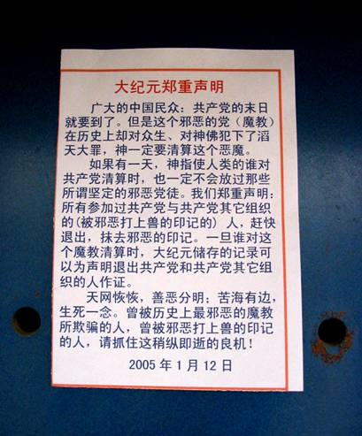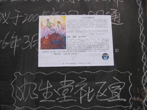 ![]() 贴在府西街汽车站广告栏上的光盘《2006年全球华人新年晚会》 | ![]() 贴在鱼池街一家商店门口的不干胶《曝光秘密集中营》 |