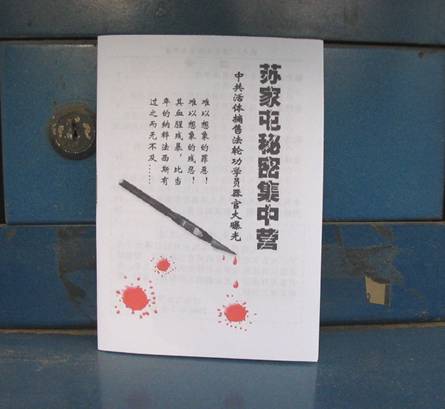 ![]() 放在太原市人民政府主楼三层的小册子《苏家屯秘密集中营――中共活体摘售法轮功学员器官大曝光》 |
