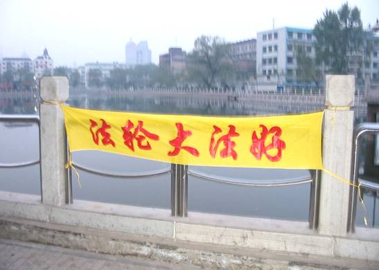 ![]() 城西水系路边悬挂的条幅“法轮大法好” | ![]() 贴在城西水系墙上的各种真相不干胶 |