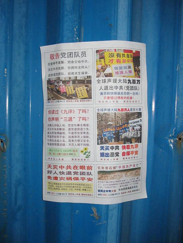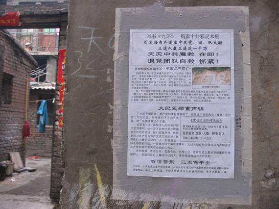 ![]() 贴在半坡街社区公告栏中的《九评》宣传画和不干胶“SOS紧急呼吁 停止虐杀” |