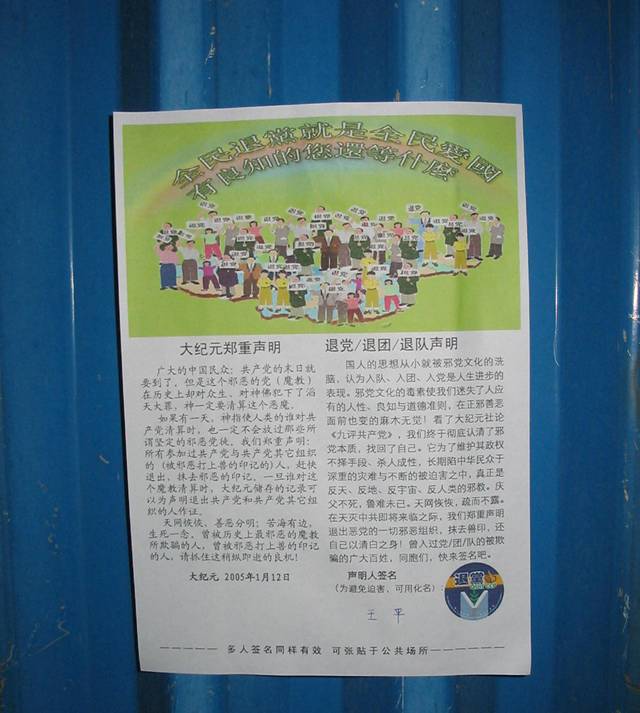 ![]() 张贴在城西水系附近工地上的不干胶“三退”宣传画 | ![]() 张贴在城西水系附近工地上的不干胶“全国退党就是全民爱国”及退党签名单,方便人们签名 |