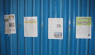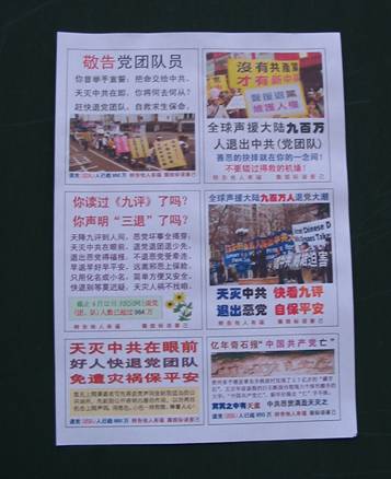 ![]() 张贴在奶生堂社区黑板报栏上的不干胶《大纪元郑重声明》和三退签名单,供居民签名 |