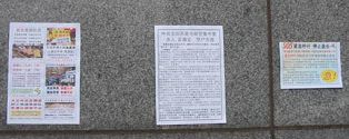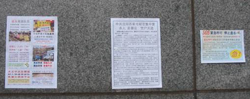 ![]() 贴在馒头巷广告栏上的不干胶《紧急救援!遏止中共解体前的灭口计划》等 | ![]() 张贴在开化寺广告栏里的不干胶《曝光中共活体摘取法轮功学员器官的惊天罪恶》等 |