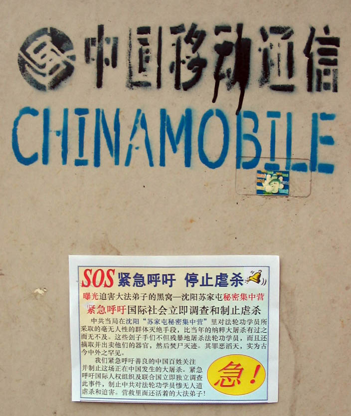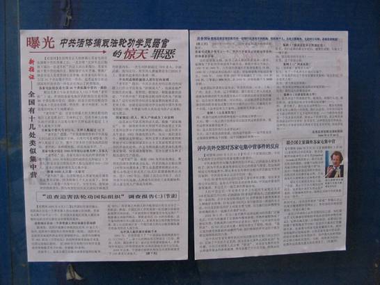![]() 张贴在半坡东街电话厅外的不干胶《曝光秘密集中营》、《SOS紧急呼吁 停止虐杀》 |