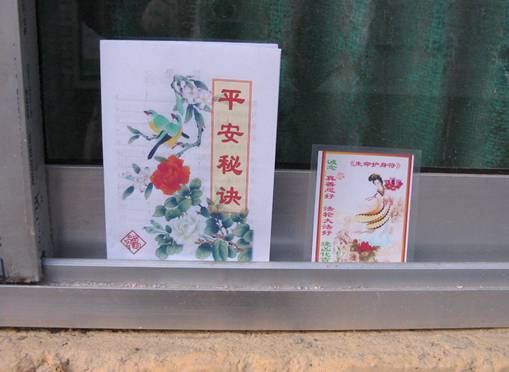 ![]() 放置在食品街一民工住宅的小册子《平安秘诀》和卡片《生命的护身符》 |