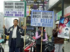![]() AIT现场外有多名法轮功学员举真相展板 |