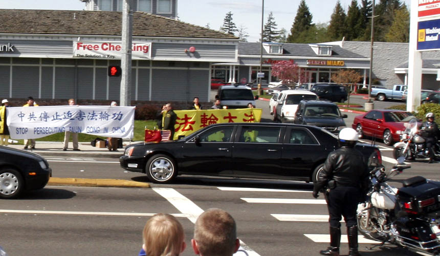 约11点45分,胡的车队在抗议人群前经过,许多坐在车内的人,透过车窗观看法轮功学员打出的横幅信息。