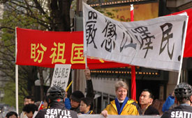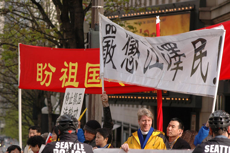 在西雅图市中心,胡一行入宿的Fairmont Olympic酒店外,在其到达前,一个拿着话筒、身穿黑色夹克的中年中国人,唆使一些亲共人士拿着血色横幅,站在大马路上,挡在法轮功学员的横幅前,后被警察制止,并勒令其离开。
