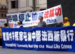 湾区法轮功学员迪安首先在集会上发言,他首先介绍了法轮功在世界的洪传,以及中共对法轮功的迫害。他说,江泽民1999年发动的对法轮功的迫害采取了“名誉上搞臭,肉体上消灭,经济上搞垮”的政策。