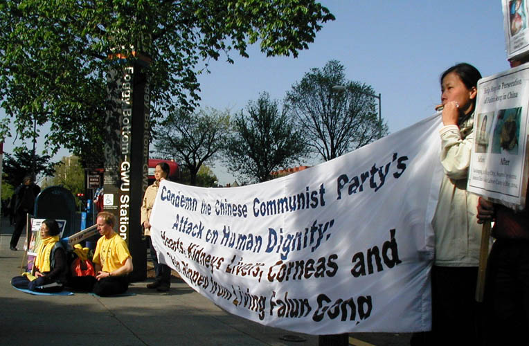 没有参与给政要讲真相的各国法轮功学员,都在市中心各地铁站口、公园游人密集的地方举横幅,发资料,由于一上午风雨连绵,很少有人愿意停下脚步接资料,法轮功学员不停的发正念,下午阳光终于重现,人们也好象苏醒了似的,纷纷接过学员递上的资料。在美国国务院前有一名中国代表团的成员,特地到横幅前拍照,并对学员说你们做的工作很有必要。另一位官员对法轮功学员流露出非常了解的表情,并连声祝学员好运。