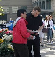 ![]() 法轮功学员(左一)在华盛顿DC的地铁站给路人讲真相 |