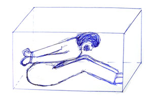八大队总是利用心狠手辣、凶残暴烈的抢劫犯杀人犯来直接参与迫害大法弟子。大法弟子李春晓刚被分入女监八大队,邪恶犯人秦丽英、郑秋(此二人心肠歹毒,曾用极其残忍的流氓手段迫害大法弟子张丽娜、张华萍,罪恶累累)就劝她“转化”,李春晓不转化,白天秦、郑二恶人就把李的双手反绑于后背,让她坐在高不过60CM,长不过110CM,宽不过40CM的木箱中(如下图)。因木箱过矮,李的头不能抬起;木箱太短,腿只能弯曲。这个木箱是八大队缝纫车间劳工身边装布料、放零活的箱子,一人一个。为防止李春晓喊叫,秦、郑二人用宽胶带把李春晓的嘴封上,绕在头发上。从早6:30出工到晚9:00收工,李春晓白天整天就坐在木箱中,收工时已浑身颤抖,勉强行走。
