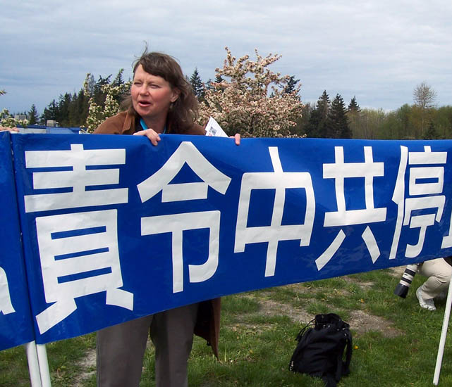 在星期三胡锦涛一行到波音公司访问时,法轮功学员在外面请愿。一位叫Katherine的西雅图人过来帮助举着横幅,并学会了用中文喊“法轮大法好”的口号。她对记者说,我看了法轮功的资料,我认为中共对法轮功的迫害十分荒唐。很明显,法轮功是非常美好的事情,可是中共却不允许法轮功存在。中共不允许人们拥有和平。中共害怕和平,这说明中共是非常虚弱的。