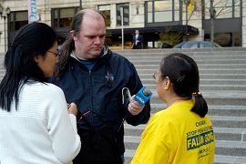 过往路人看到法轮功学员打着“中国劳教所从法轮功学员身上活体摘取器官!”等横幅,纷纷驻足了解真相。来费城旅游的南希女士震惊于眼前所看到的一切,她说:“没有比这更残酷的了!这不跟当年的纳粹大屠杀一样吗?” 她先生把眼前的一切都给拍照了下来。