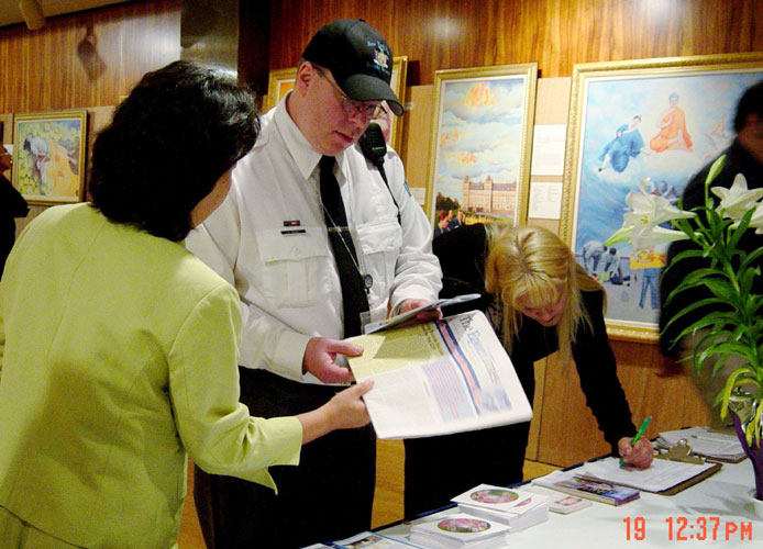 展厅外,一位匆匆路过的年轻白人女子被法轮功真相传单和画展通知所吸引,离开不久后,她又带来一位身扛摄像机的摄影师小伙子。原来他们是电视记者,在纽约州一家专门制作电视节目的公司工作,该公司为纽约州以及世界媒体提供高质量的电视节目。两位记者从未听说过法轮功,更不了解法轮功被中共迫害的情况。一位学员详细的向他们介绍了法轮功真相。在摄影的过程中,女记者对油画《打毒针》揭露出来的迫害事实感到极为震惊。听到学员讲了她认识的一位遭受毒针折磨的法轮功学员一度成为植物人的经历以及有关真实故事后,女记者特地对着摄影机解说到:“这位年轻的女子拒绝放弃法轮功。警察正在给她注射损害神经的药物。经过此种折磨的人,有的成为植物人,有的被迫害致死。”采访结束后,两位记者都在呼吁信上签了名。女记者解释说,一般来说,记者不会在工作场合签名表态,但这一次他们不得不破例了。这样惨无人道的迫害必须停止。