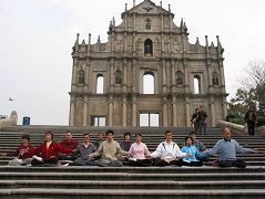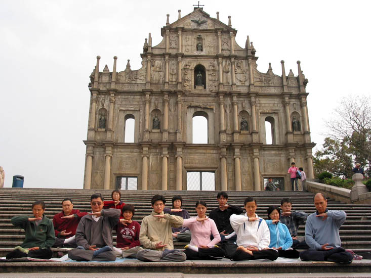 澳门法轮功学员在当地著名景点“大三巴牌坊”炼功,摄于2005年。