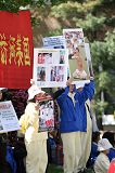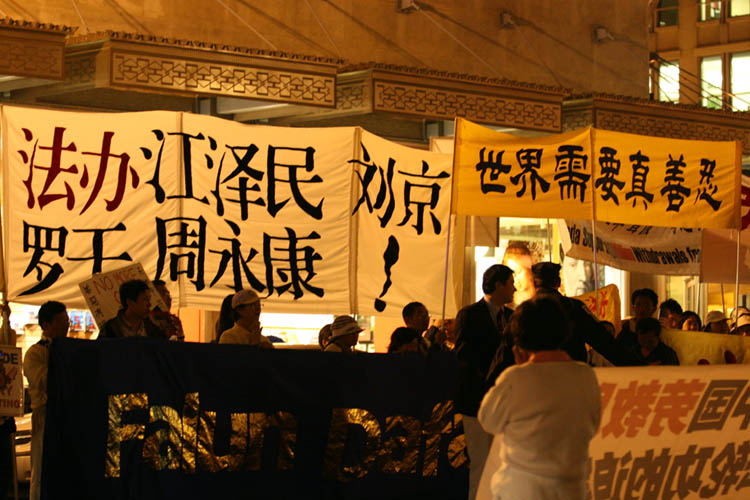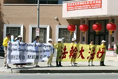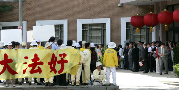 ![]() 法轮功学员在中国官员住的旅馆前打横幅 | ![]() 在中使馆前打横幅 |