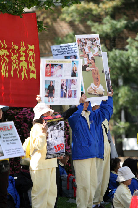 中国驻华盛顿的大使馆,是胡锦涛必去之地,法轮功学员也前往打横幅,其间许多西方民众经过皆会向法轮功学员轻鸣喇叭表示鼓励,或摇下车窗竖起大拇指。
