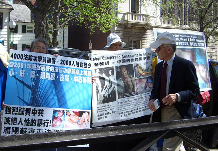 早上7点不到,法轮功学员就来到耶鲁大学外的主要街道,展开横幅和真相展板;并不断向拿着血旗的中国人讲真相;更有学员现场宣读“九评共产党”,有些中国人在听,也在思考。