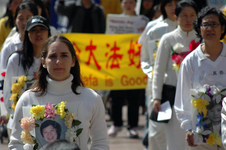 沿途的人们清晰的看到这群有许多中国人面孔的游行队伍中,身着素衣的女士和孩童举着被中共迫害致死的法轮功学员的遗像,高举的横幅传达着“在中国,法轮功学员正被酷刑虐杀”的消息和“立即制止中共对法轮功七年的迫害”、“制止中共劳教所活体盗取人体器官”的呼吁。还有那面金黄色的“法轮大法好”横幅,以及“世界需要真、善、忍”和“法轮大法使亿万人身心受益”的横幅,散发着善的力量,和平而坚韧不屈。