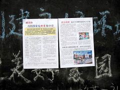 ![]() 张贴在惠民北街电线杆上的不干胶《九评》宣传画。 | ![]() 4月22日早上5点,水西关水一巷报栏张贴的不干胶《法轮大法洪传全世界》、《明慧周报》(山西版)。 |