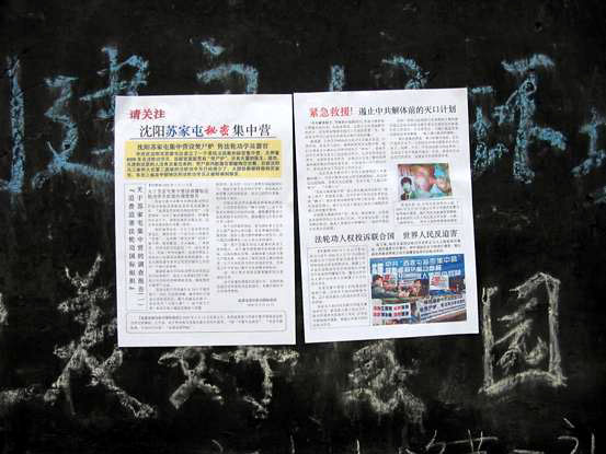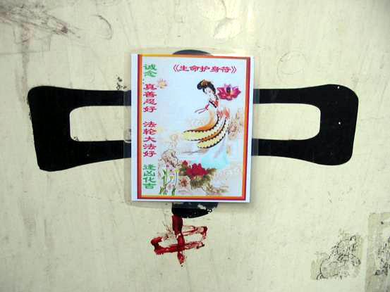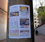 ![]() 桃园正街山西旅游规划中心门牌上的护身符。 | ![]() 太原主要街道新建路汽车站广告栏张贴的“中国活体器官移植的黑幕”。 |