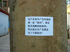![]() 新建南路第三社区黑板报张贴的不干胶“请关注沈阳苏苏家屯秘密集中营”。 | ![]() 文源一条 一单位门牌上张贴的“国外大游行:声援1000万退出中共,见证历史大转折”微型不干胶。 |