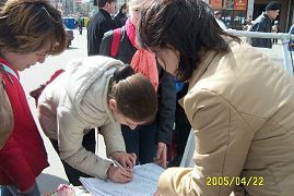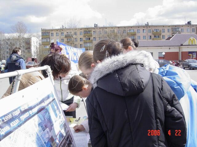 一位老年人走到这里接过真相资料,和学员谈了很久,他说:“共产党和独裁分不开,中共不管是换哪个领导都一样,都是为维护它的政权而不是为人民,有共产党就不可能有信仰自由。为了它的权什么坏事都会干。人民要想有民主和自由,只有共产党下台。俄罗斯人民能有今天的信仰自由和民主权利,虽然还不完善,那也是唾弃共产党的结果。”他主动签名支持法轮功的反迫害。还有好几位老人也都签了名支持法轮功。