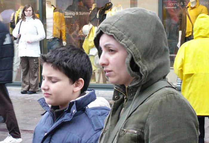 一位中年妇女带着两个孩子瞪大眼睛看着演示。当她听说这是每天真实发生在中国的一幕时,泪水涌上她的双眼。看到她难过的说不出话的样子,学员递给她一张传单说,“您应该了解真相“。她点点头不无沉重的离开了。
