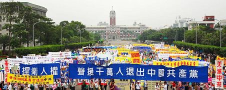 声援千万人退出中共恶党大游行声援千万人退出中国共产党大游行,吸引了1万5千名来自台湾各地的民众参加,其中法轮功学员组成的反迫害大队,制止中共迫害法轮功的游行队伍,张张触目惊心的照片及中共盗卖人体器官行动剧,在前导的新唐人旗鼓队震天的鼓声引导下,震醒了台北市民。