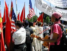 “你到底在哪里呀!”一个被中使馆组织来欢迎中共党魁的女孩,打手机找她的男朋友,“我就在‘天灭中共’底下呀,我旁边是‘法轮大法好’,还有……,全是法轮功的人。