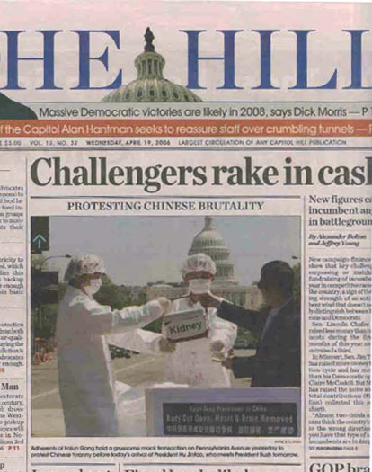 图:昨天法轮功学员在宾州大道反对中共暴政的游行中模拟展示中共残忍的活体摘除器官贩卖交易。第二天一早“国会山报”(The Hill) ,一份专门有关国会资讯的政府免费报纸在国会各办公室供阅,报纸头版醒目大幅图片报导了法轮功学员模拟展示中共残忍的活体摘除器官贩卖交易的画面。