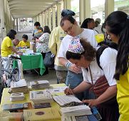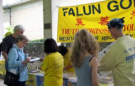 一对青年男女轻松愉快的来到展位前,学员递给他们真相传单。“这是什么?”男青年好奇的问。学员从什么是法轮功开始讲起,一直到在中国持续近七年的迫害,还有最近揭露出来的中共盗取器官罪行。那位男青年大惑不解的问:“我觉的这个功法对社会是有好处的呀!为什么他们(中共)要迫害?”学员于是又讲述了中共的邪恶本质决定了它无法容忍对人们对“真善忍”的信仰。这对青年表示明白了,但还是为中共的不可理喻而摇头叹气。