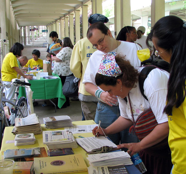 活动在傍晚时分结束,学员们准备的有关真相资料早已发放一空,写满名字的签名表带着善良的美国民众对法轮功的支持和对中共的谴责,将被寄给美国总统、议员和相关政府部门。