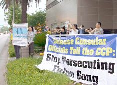 “4.25”七周年之际,美国休士顿法轮功学员在中领馆前集会,声讨中共迫害法轮功的暴行,悼念被迫害致死的大陆同修。