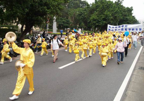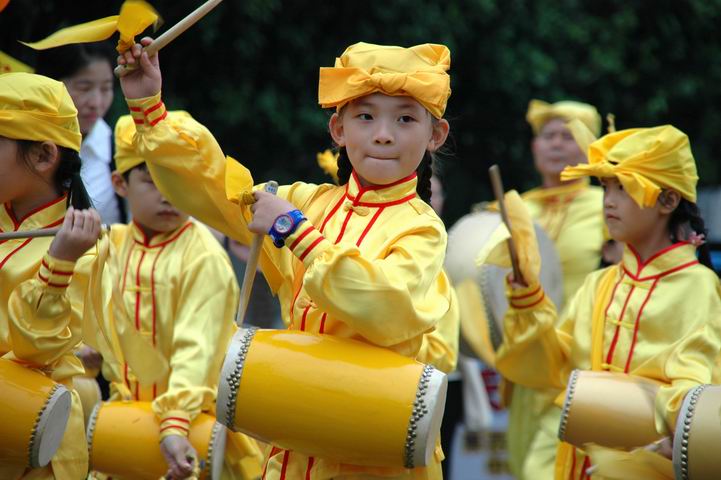 这些孩子由于一早就在行前练习,中餐也草草果腹,加上当天连续击打腰鼓达五、六个小时;游行当中,最小的成员不满六岁,他们没吃、没喝、没上厕所,却没有一个人喊累,没有一个人把挥舞的鼓棒放下,这些努力用心只为了一个,就是他们要用自己稚嫩的双手声援“反迫害”!