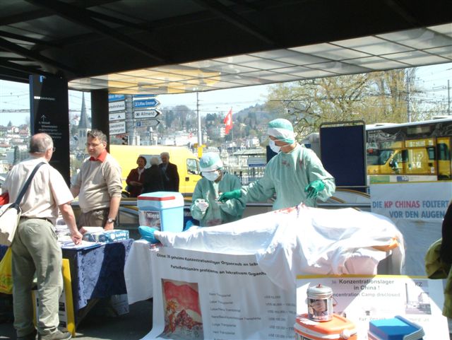 很多人看到模拟手术后惊呆了,纷纷询问这是真的吗?学员告诉他们:“我们现在是在演示最近得以证实,一直在中国发生的事情——中共迫害政策下,医生从活生生的被绑架非法关押的法轮功学员身上摘取器官,从中谋取暴利,并焚尸灭迹,您看手术台前所列的价目表正是从中国医院的网上摘录的。”很多仍没有听说过法轮功的人会问法轮功是什么?学员介绍说:“法轮功是一种来自中国的修炼方法,有5套缓慢圆的功法,其中包括打坐,正如那位女士演示的。法轮功的特点是教人按‘真善忍’做个好人,不断修正自己。但中共不允许人们按‘真善忍’生活,容不得法轮功学员有自己的信仰,从1999年7月开始迫害法轮功学员,将学员绑架、非法关押、用种种酷刑折磨。您看,这些都是辗转从中国大陆传出的受迫害后的照片。”