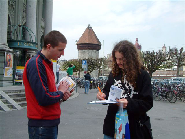 三位来自意大利的游客索要意大利文的真相材料,学员在给了材料后,因语言不通,不知如何向他们解释中共夺取器官,残杀法轮功学员的罪行,就没有進一步请他们签名。但其中一位女士看过材料和桌上的德语签名表后,主动签名。