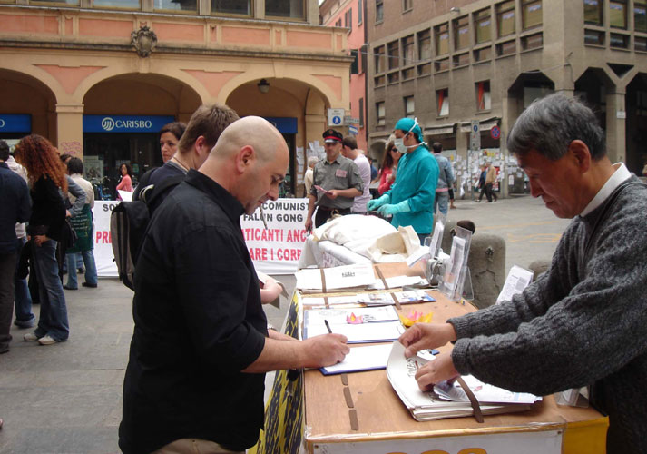 【明慧网2006年4月27日】2006年4月25日,正值4.25和平上访七周年纪念日,意大利部份法轮功学员到伯伦涅亚市(Bologna)街头,演示在中共集中营、劳教所中发生的活体摘器官暴行,呼吁国际社会帮助制止中共对法轮功学员的屠杀和迫害