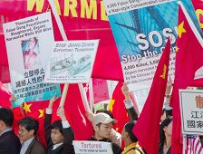 文章结尾是一位从德国慕尼黑来的西人法轮功学员:“她举着一张显示在中共监狱被拷打的憔悴囚犯的海报,上面写道‘中共集中营出售人体器官牟巨利’。她讲话时,泪水顺着脸颊滚落。”