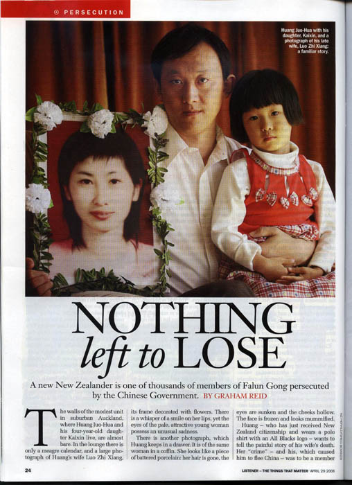 【明慧网2006年4月27日】(明慧记者安霓编译报导)连续两年被评为新西兰最佳时事杂志的《倾听者》(Listener)在4月29日的期刊中以3个整版的篇幅报导了法轮功真相和黄国华一家的悲惨遭遇。《倾听者》是新西兰唯一一份全国发行的时事周刊。