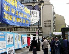 2006年4月25日,是法轮功学员万人和平上访七周年的日子,巴黎法轮功学员在法新社和法国股票市场所在地La Bourse广场前,揭露中共持续7年对法轮功学员的残酷迫害,并声援一千万中国勇士退出中共。